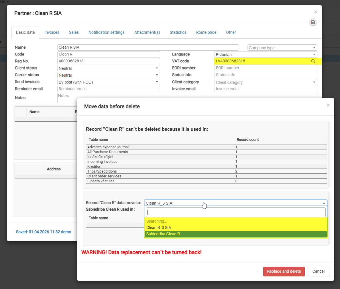 In the top table, you’ll see all places where the company is linked (e.g., invoices, purchases, shipments, etc.).