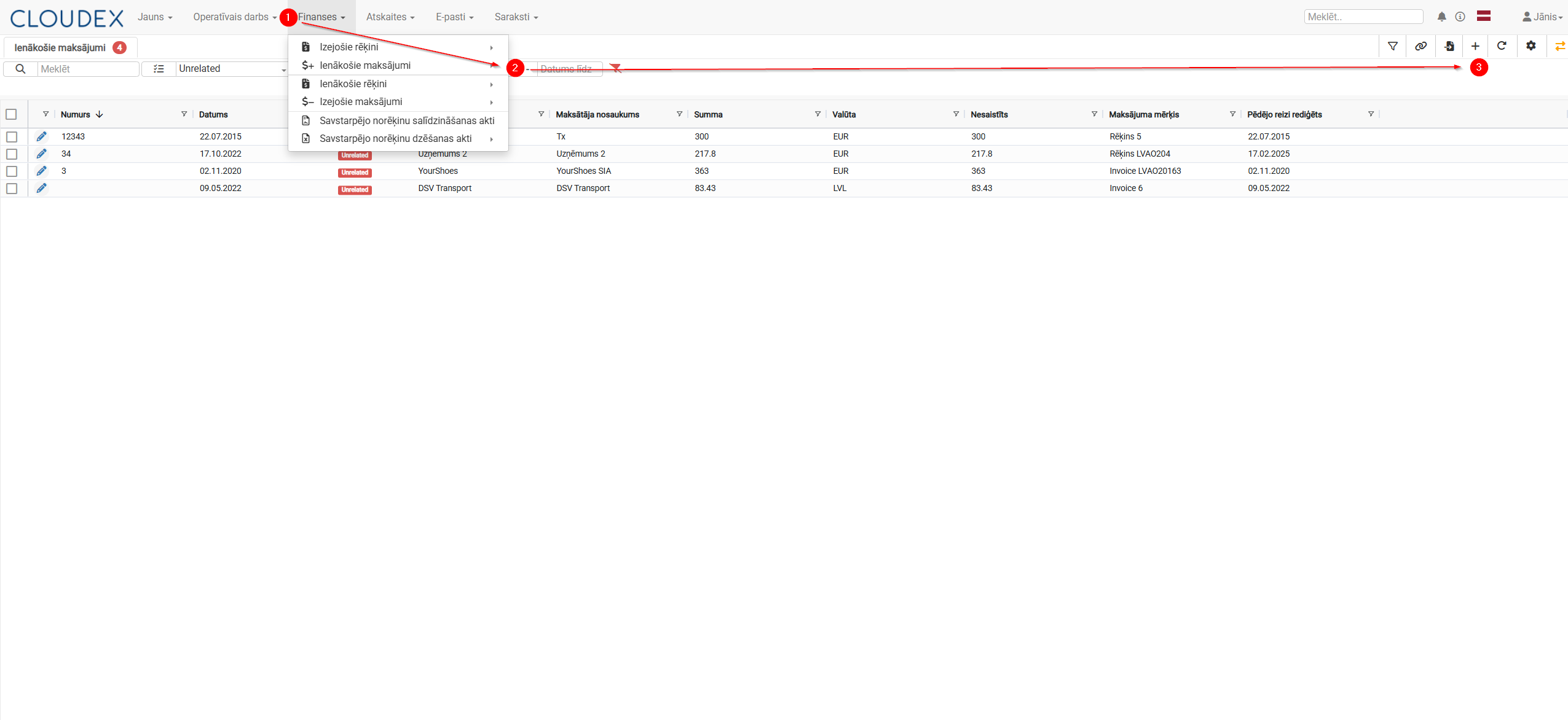 3. Sistēma atvērs Ienākošo maksājumu sarakstu, kur varēsiet: