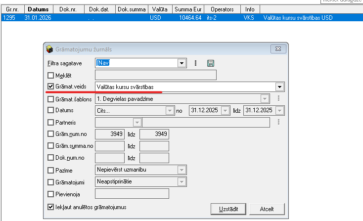 Valūtu kursu svārstību aprēķina rezultātā izveidotie grāmatojumi pieejami Ozols ‣ Virsgrāmata ‣ Dokumenti ‣ Grāmatojumu žurnāls, kur tos iespējams atlasīt, grāmatojuma žurnāla filtrā, norādot attiecīgo grāmatojuma veidu: