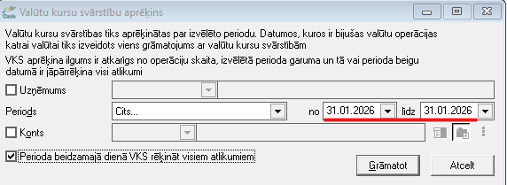 1. Lai veiktu Valūtu kursu svārstību aprēķinu, nepieciešams norādīt periodu, par kuru šis aprēķins tiks veikts, kā arī lai aprēkinātu svārstības visiem atlikumiem pa dimensijām, perioda beidzamajā dienā, jāatzīmē izvēles rūtiņa: