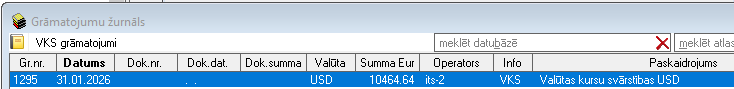 Tiks atvērts grāmatojumu žurnāla logs, kurā būs pieejami valūtu kursu svārstību aprēķina rezultātā izveidotie grāmatojumi, kurus iespējams atvērt, izmantojot rīku joslā pieejamo komandpogu Atvērt: